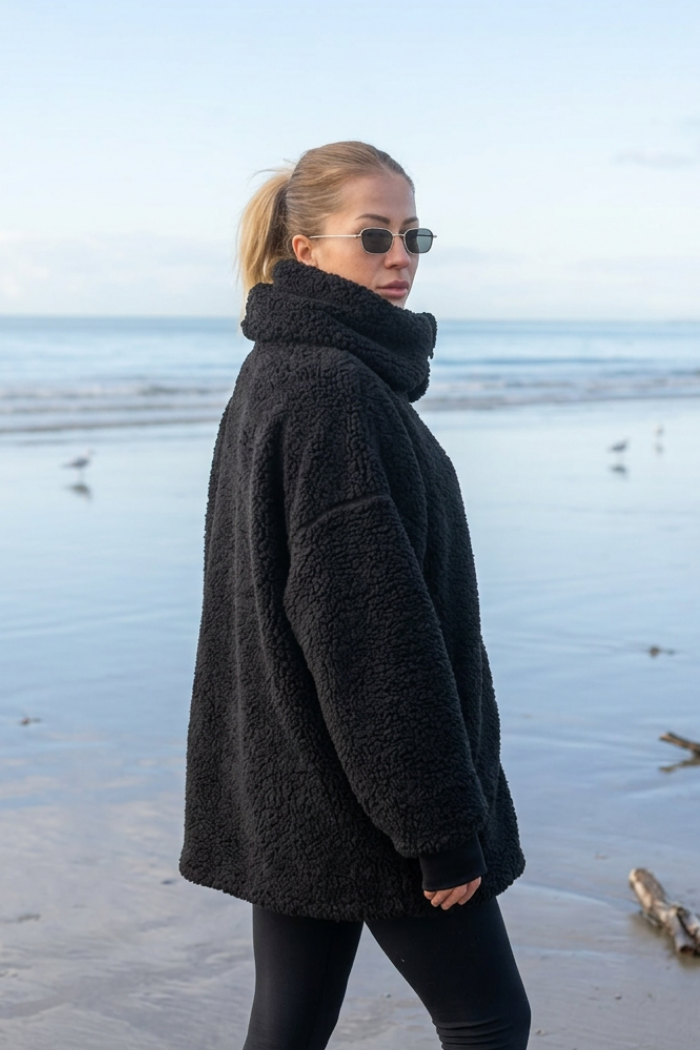 Possui meia gola alta que dá destaque ao visual e traz sensação de aconchego. O caimento é solto, ideal para combinar com peças de cintura alta.