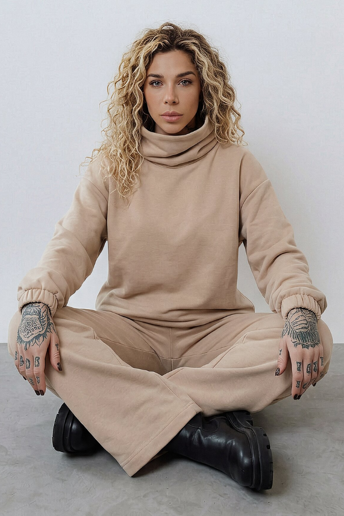 Modelagem ampla e reta, em tecido de moletom macio. Possui cós liso na parte frontal, proporcionando acabamento limpo e elegante, e cós traseiro com elástico embutido e franzido, garantindo ajuste confortável à cintura. Caimento fluido e confortável, ideal para composições casuais ou mais arrumadas.